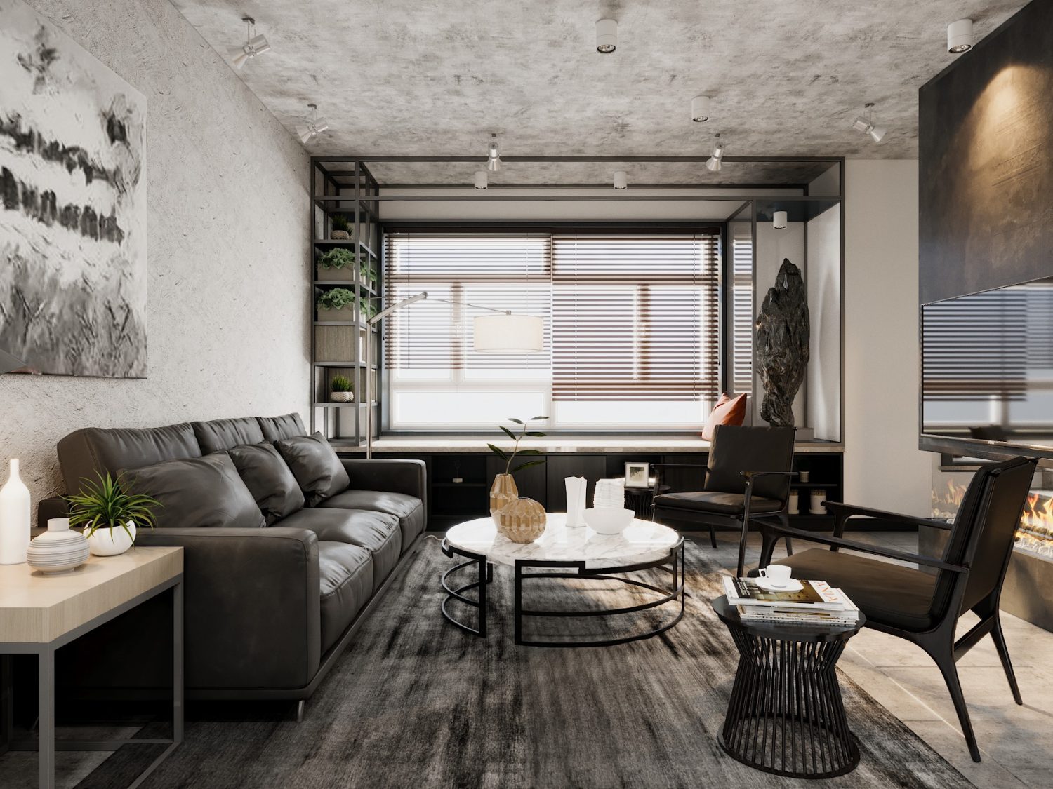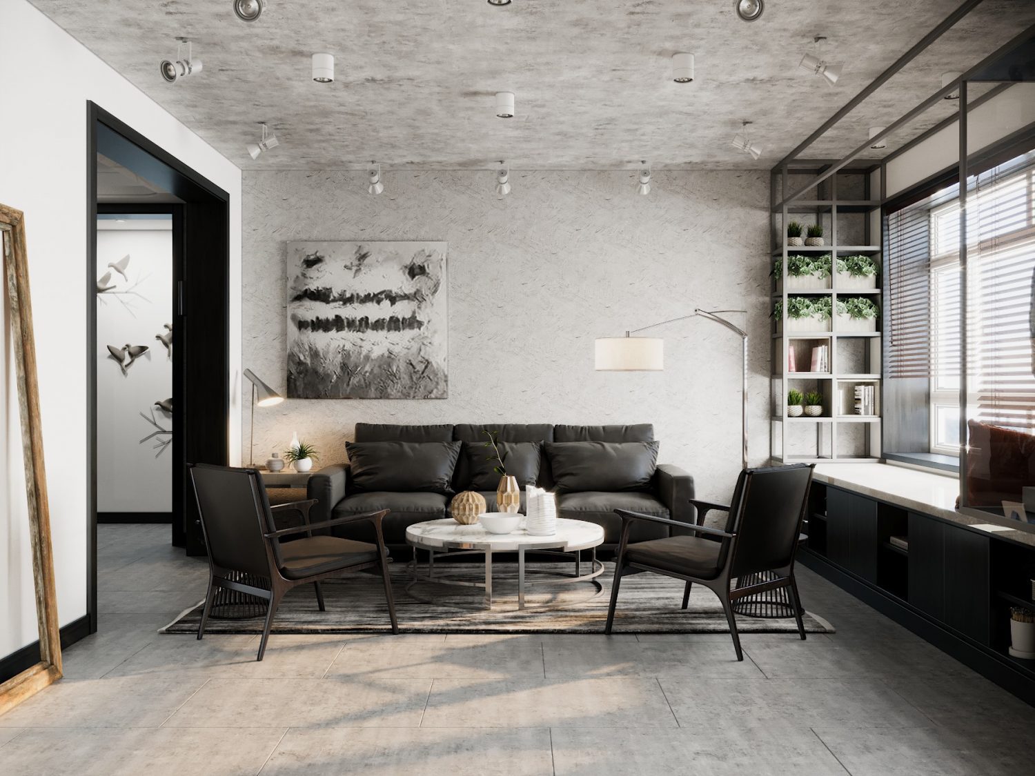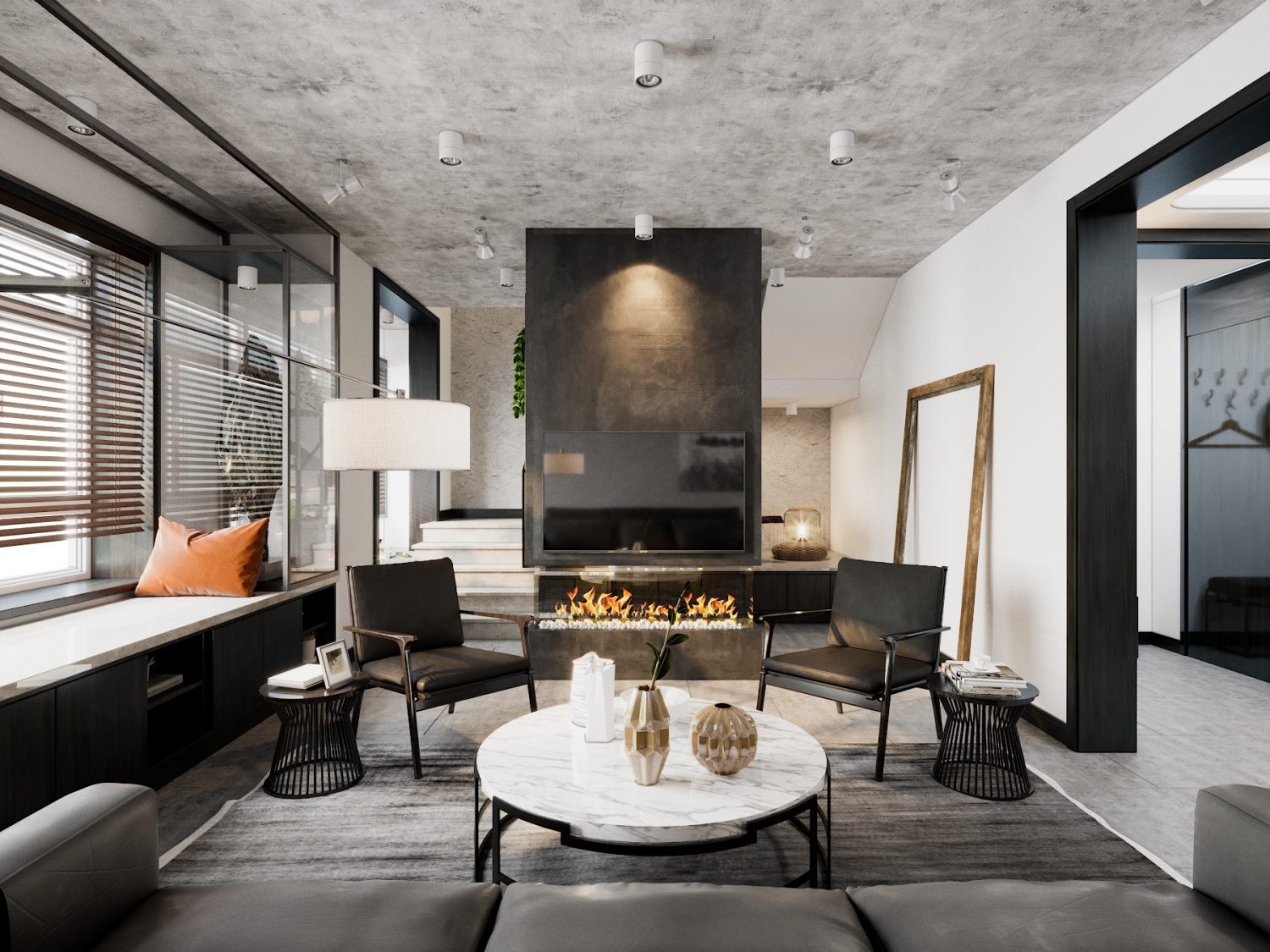 The living room area is thoughtfully arranged with a comfortable seating arrangement, featuring a contemporary sofa set, armchairs, and possibly a coffee table. The design incorporates sleek lines and modern finishes, creating an inviting and trendy ambiance.