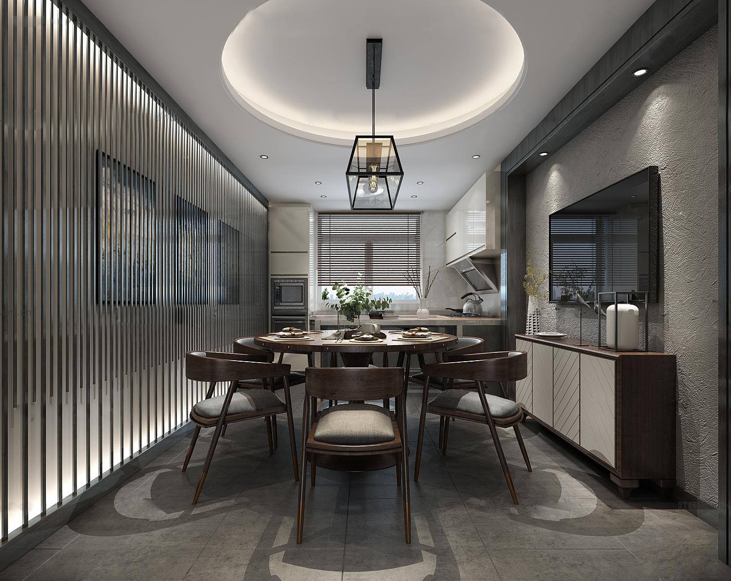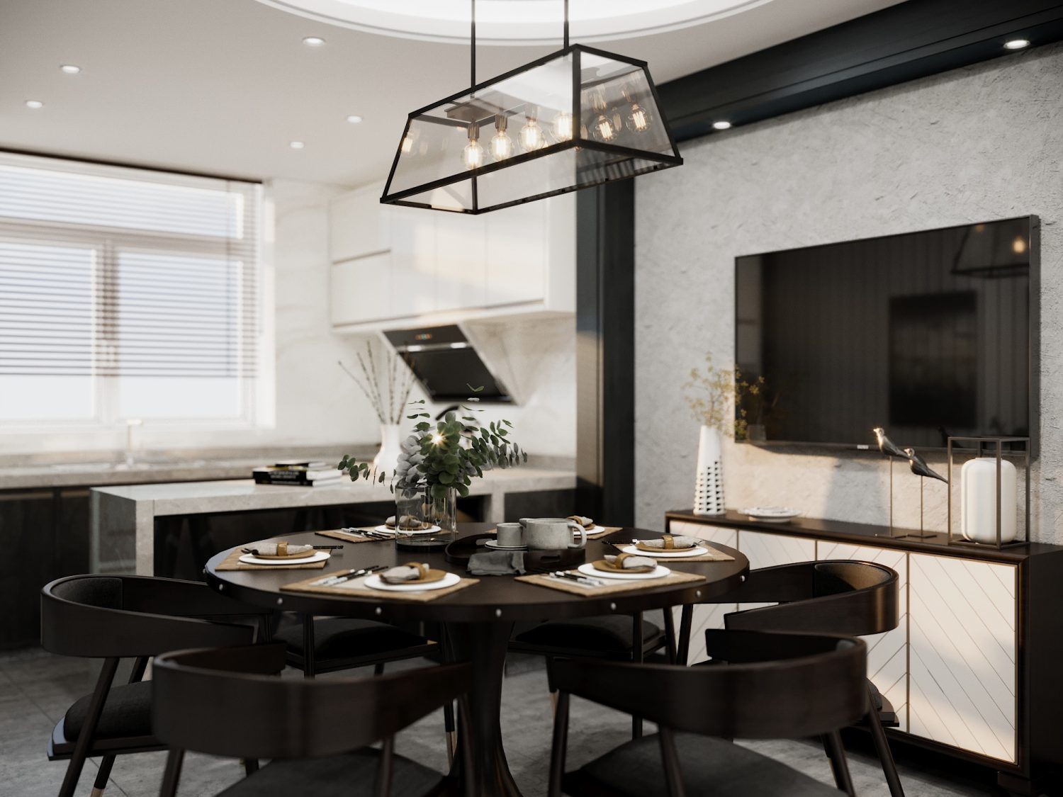 Adjacent to the living room, the kitchen area boasts a seamless and functional layout. It showcases well-designed cabinetry, a sink, stove, and possibly an island or breakfast bar for casual dining. The combination of practicality and aesthetics in the kitchen space enhances the overall appeal of the interior model.