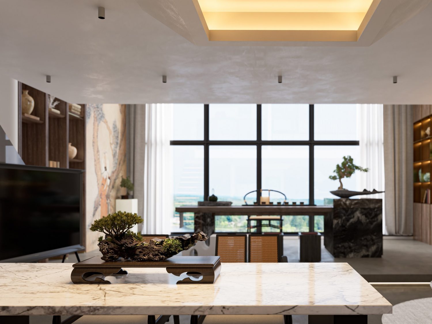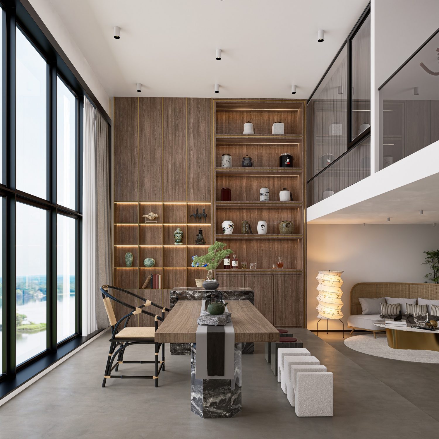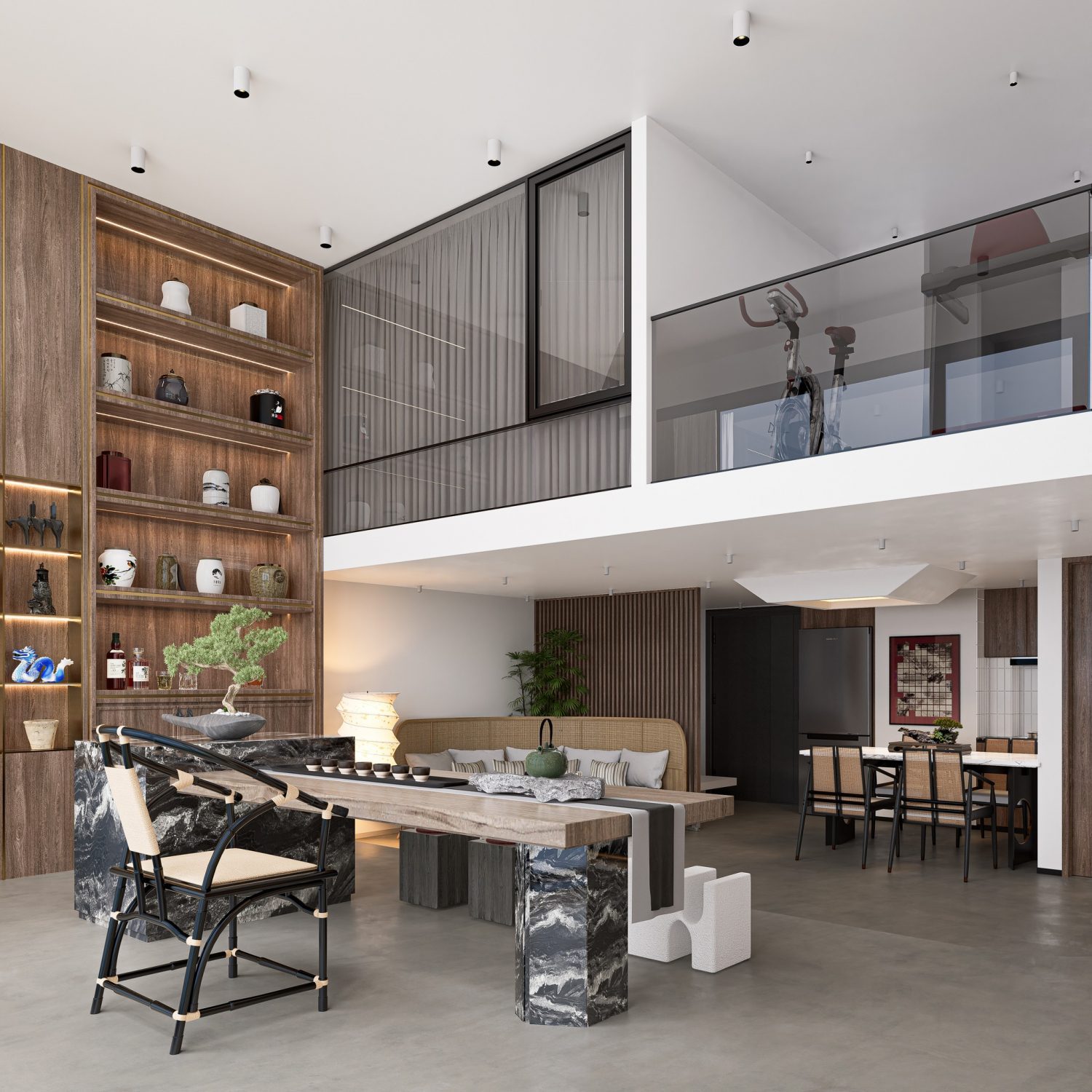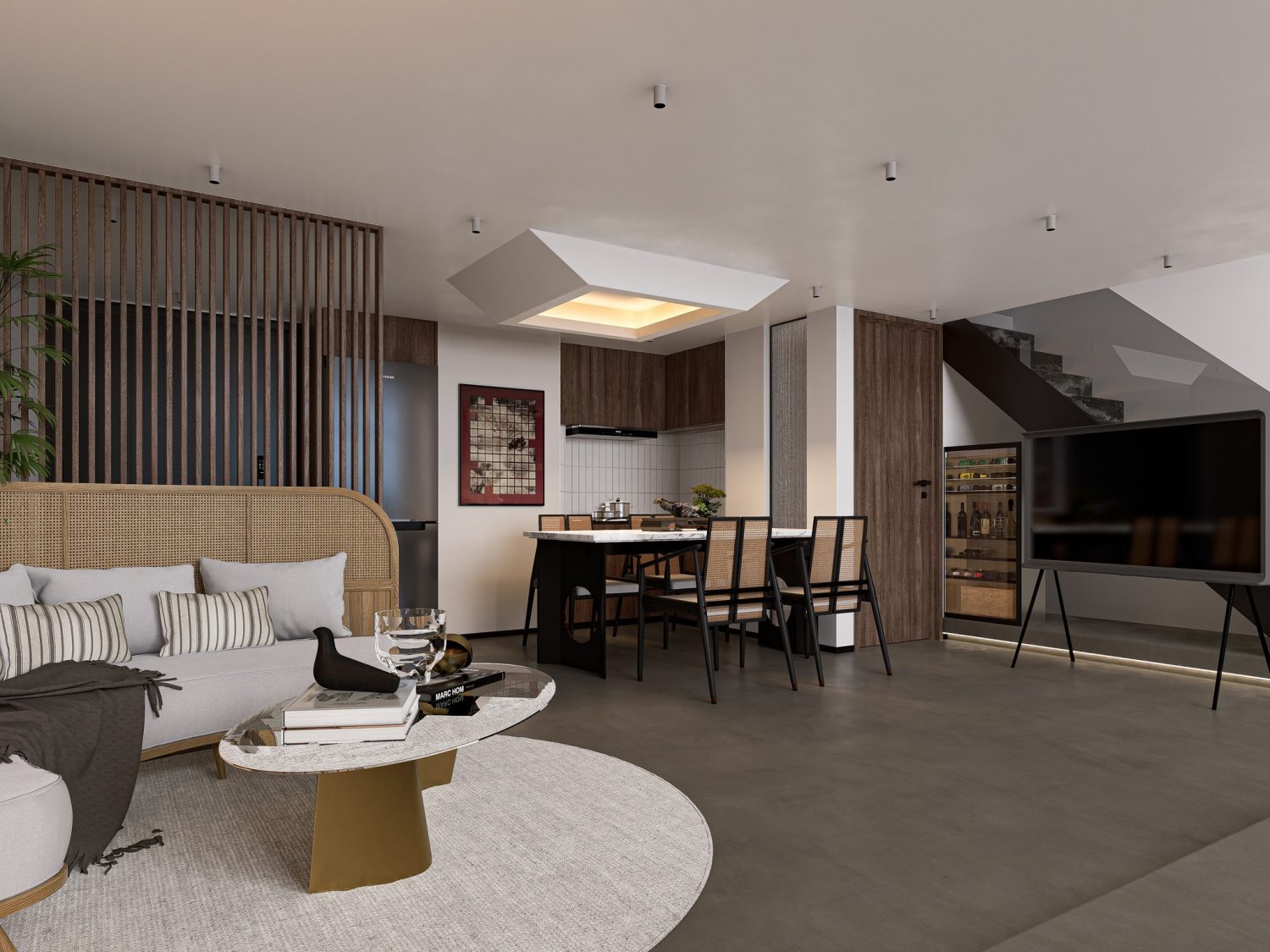 In the living room area, you will find a comfortable and inviting seating arrangement, such as a sofa set, armchairs, and possibly a coffee table. The design incorporates contemporary elements, with sleek lines and modern finishes, creating a trendy and sophisticated ambiance.